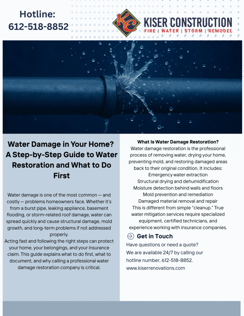 Water damage is one of the most common – and costly – problems Minnesota homeowners face. Whether it’s from a burst pipe during a deep freeze, a leaky appliance, an ice dam, or storm-related flooding, water can spread quickly and cause structural damage, mold growth, and long-term problems if not handled properly.